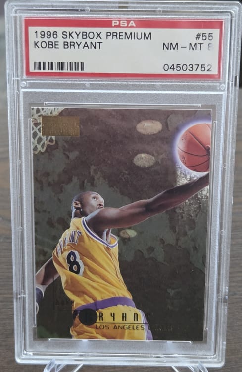 You are viewing the magnificent Kobe Bryant Rookie card. This basketball card holds significant value and reminds us all of the amazing phenomenon, Kobe Bryant. The card was produced his rookie year in 1996. It is a Skybox Premium product. It is card #55 and graded by PSA as a level 8 condition. Near Mint-to-Mint condition encased in a PSA slab. Get it while you can!!